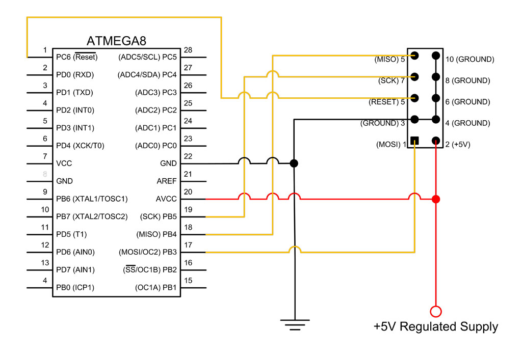 All that's left is to connect the MOSI, MISO, SCK, VCC, GND and the RESET pin (which we just defined) on your programmer to the respective pins on your microcontroller. You should be able to find this by googling the pinout of the two boards. Here is the wiring for the ATMega8 to the WeMoS D1 mini.