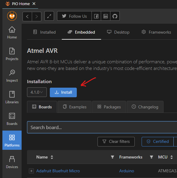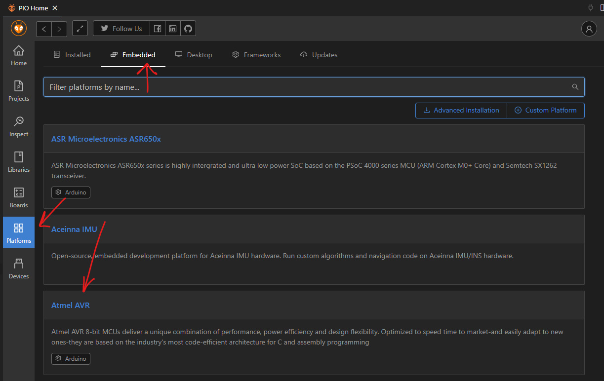 We need to add the Atmel AVR Platform so that we can get access to all the necessary libraries for using the IO Ports on our microcontroller. This also automatically defines certain board specific variables that will help make uploading work properly.