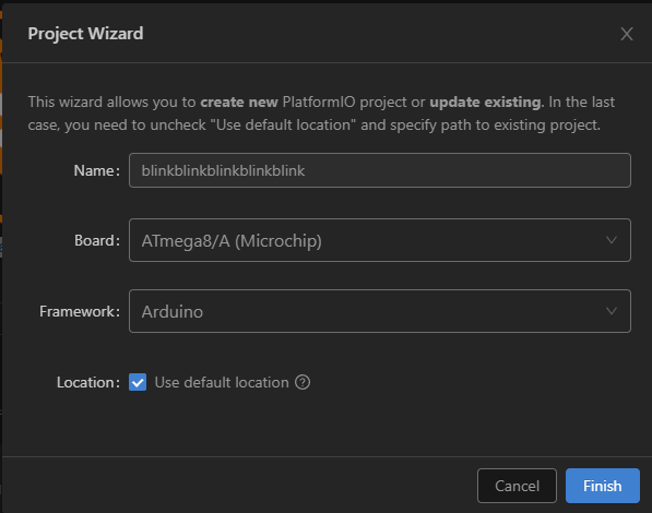 Name the project whatever you want. In my case my board is an ATmega8, but select whichever board you are using. Feel free to change the location your project is saved by unchecking the "Use default location" box. Click Finish.