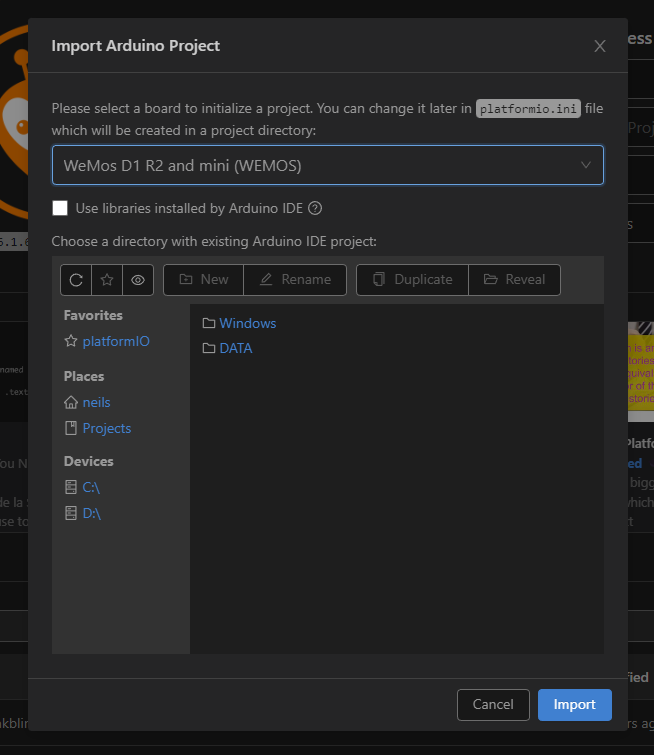 Click on "Import Arduino Project", and select the place in which you saved the example code (make sure to unzip it first). Also select your board in the dropdown, in my case, I've selected "WeMos D1 R2 and mini (WEMOS). Click "Import".