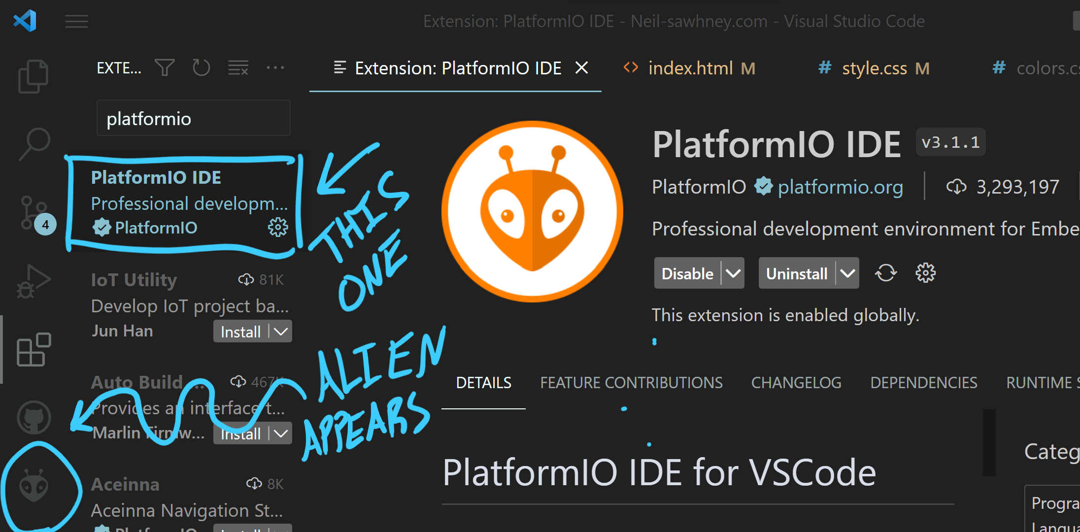 Click the PlatformIO icon (the alien) in the bottom left corner of VSCode and click "PIO Home → Open" under QUICK ACCESS.